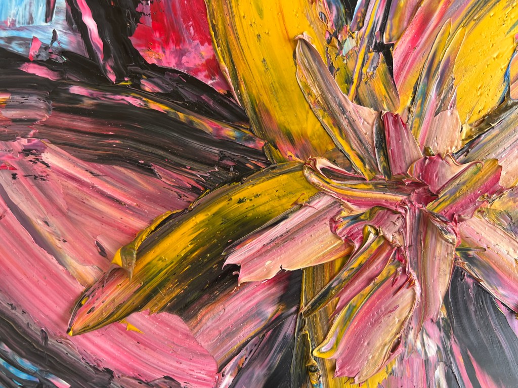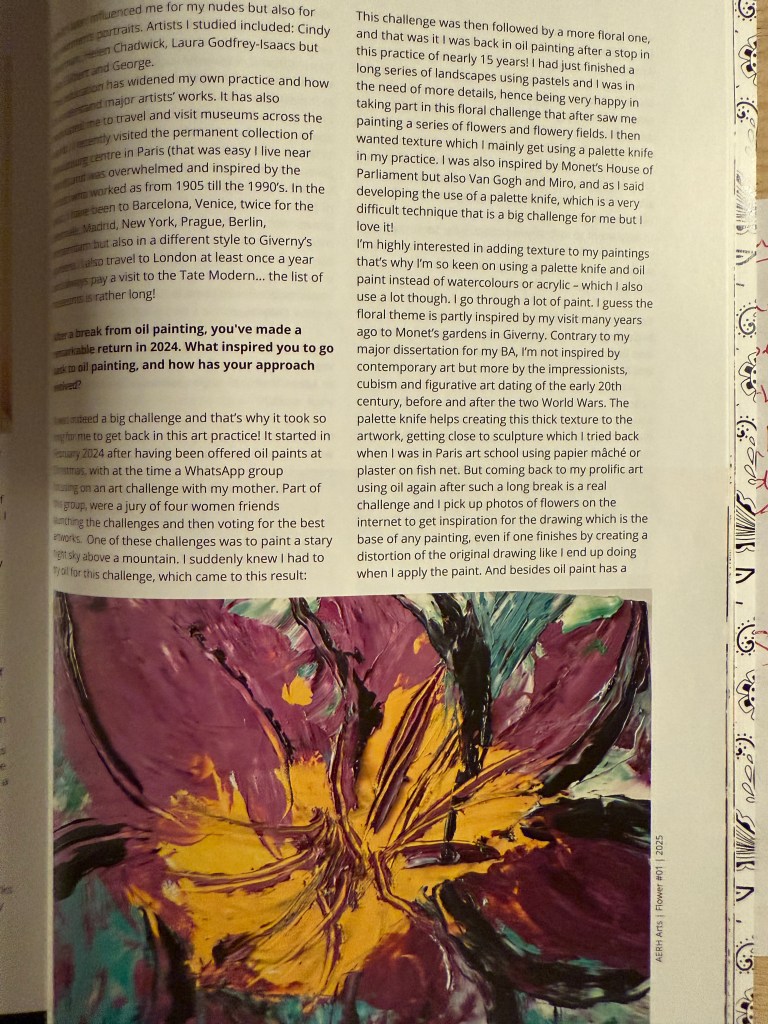 I’m highly interested in adding texture to my paintings that’s why I’m so keen on using a palette knife and oil paint instead of watercolours or acrylic – which I also use a lot though. I go through a lot of paint. I guess the floral theme is partly inspired by my visit many years ago to Monet gardens in Giverny. Contrary to my major dissertation for my BA, I’m not inspired by contemporary art but more by the impressionists, cubism and figurative art dating of the early 20th century, before and after the two World Wars. The palette knife helps creating this thick texture to the artwork, getting close to sculpture which I tried back when I was in Paris art school using papier mâché or plaster on fish net. But coming back to my prolific art using oil again after such a break is a real challenge and I pick up photos of flowers on the internet for inspiration in the drawing which is the base of any painting even if one finishes by creating a distortion of the original drawing like I end up doing when I apply the paint. And besides oil paint has a smell what with the use of turpentine. I used to love visiting artists’ studios at Paris Ecole des Beaux-Arts on the way to my art school. Smelling spirits and observing. Now I do it on my little workshop at home.