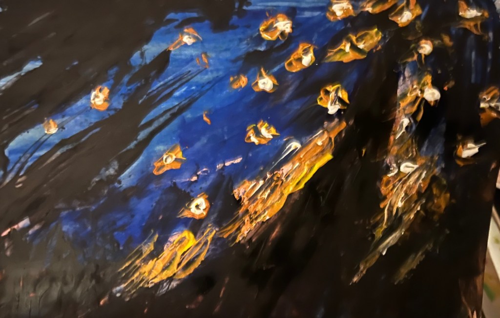 It was indeed a big challenge and that’s why it took so long for me to get back in this art practice! It started in February 2024 after having been offered oil paints at Christmas, with at the time a WhatsApp group challenging my mother with a jury of four women friends giving us challenges and then voting for the best art works, and one of the challenges was to paint a stary night sky above a mountain. I suddenly knew I had to try oil for this particular challenge, which came to this result:
