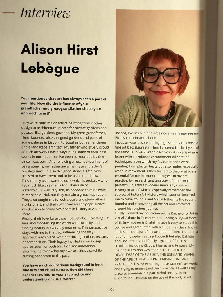 Finally, I ended my education with a Bachelor of Art in Visual Culture in Falmouth UK… being bilingual from birth (my mother is English) made it easy to study this course and I graduated with a first a first-class degree and as a the major of my promotion. There I studied a lot of philosophy, reading Foucault a lot, but also Bakhtin and Levi-Strauss and finally a group of feminist scholars, including Cixous, Irigaray and Kristeva. My major dissertation was titled THE DIALOGICAL DISCOURSES OF THE ABJECT: THE USES AND MEANS OF THE ABJECT IN WESTERN FEMININE FINE ART PRACTICES. I loved exploring these women’s art works and trying to understand their practice, as well as my place as a woman in a patriarchal society. In this dissertation I insisted on the use of the body in art… which later influenced me on my nudes but also for my women’s portraits. Artists I studied included: Cindy Sherman, Helen Chadwick, Laura Godfrey-Isaacs but also Gilbert and George.This education has widened my own practice and how to understand major artists’ works. It has also motivated me to travel and go and visit museums across the world. I recently visited the permanent collection of Beaubourg centre in Paris (that was easy I live near Paris!) and was overwhelmed and inspired by the artists who worked as of 1905 till 1990. In the past, I have been to Barcelona, Venice twice for the Biennale, Madrid, New York, Prague, Berlin, Amsterdam but also in a different style to Giverny’s gardens, I also travel to London at least once a year always paying a visit to the Tate Modern… the list is rather long!